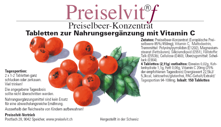 Das klassische Preiselbeerpräparat, hergestellt aus europäischen Preiselbeeren aus kontrolliert biologischem Anbau (kbA). Enthält pro Tagesportion von 2x2 Tabletten 94-