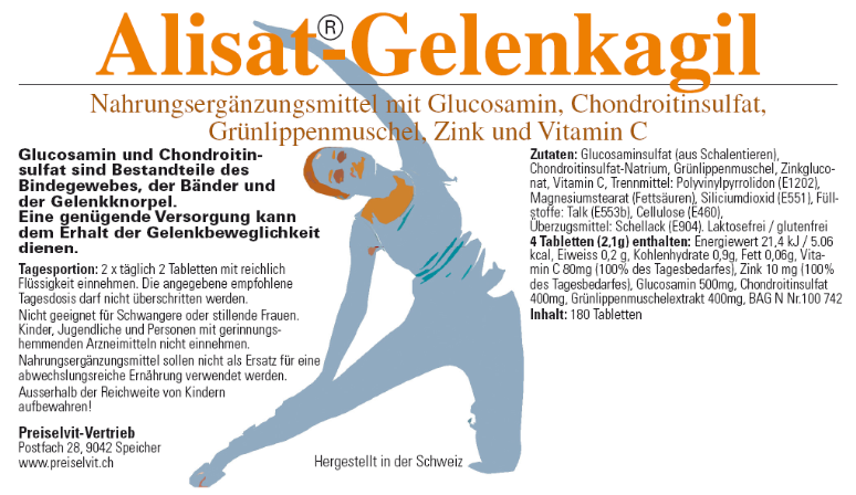 Eine Tagesportion von 2x2 Tabletten enthält: 500mg Glucosamin, 400mg Chondroitinsulfat, 10mg Zink und 80mg Vitamin C.