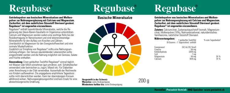 Ein gehäufter Teelöffel RegubaseBasenpulver einmal täglich mit Wasser oder Milch einnehmen (gut umrühren, evtl. Schüttelbecher verwenden) oder beimischen zu Jogurt, Müesli etc.