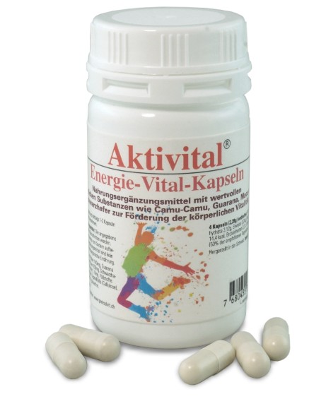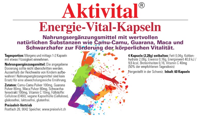 Substanzen wie Camu camu, Guarana, Maca und Schwarzhafer zur Förderung der körperlichen Vitalität.
