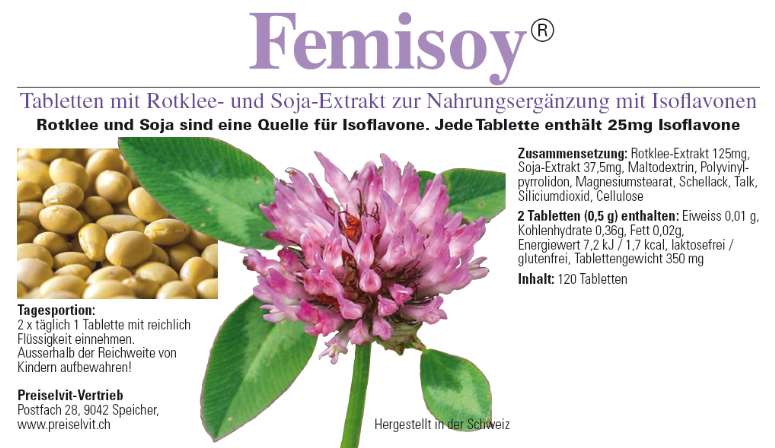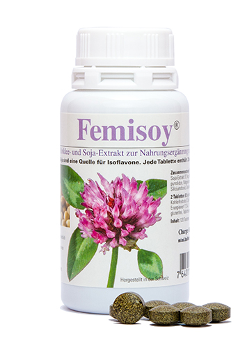 Femisoy® Soja-Rotkleetabletten für Lebensqualität in den Wechseljahren.Eine Tagesportion von 2x1 Tablette enthält 50mg Isoflavone.Frei von Gluten, Farbstoffen, Laktose und Saccharose.Packung mit 120 Tabletten.